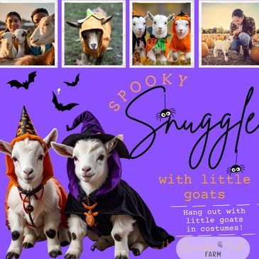 Even our little goats are getting into the Halloween spirit! Come by for a snuggly, spooky session with our younger goats—dressed up in silly seasonal costumes.