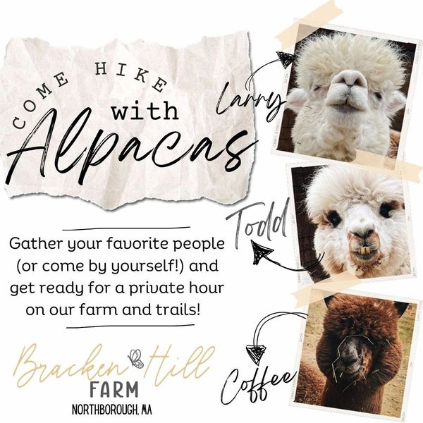 Connect with nature and make an alpaca friend (or 4), while embarking on an enchanting journey through our beautiful woodland trails. After your hike you'll have the opportunity to hang with our other farm animals!