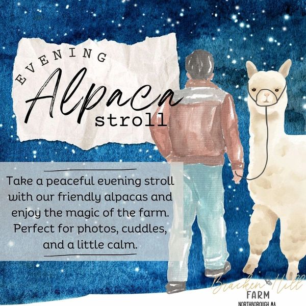Wrap up your day with an Evening Alpaca Stroll — a cozy walk through the farm trails alongside our friendly alpacas. As the air turns crisp and the sun sets over the farm, you’ll enjoy peaceful moments, alpaca cuddles, and plenty of time for photos. It’s the perfect way to slow down, soak up the season, and share a little autumn magic.